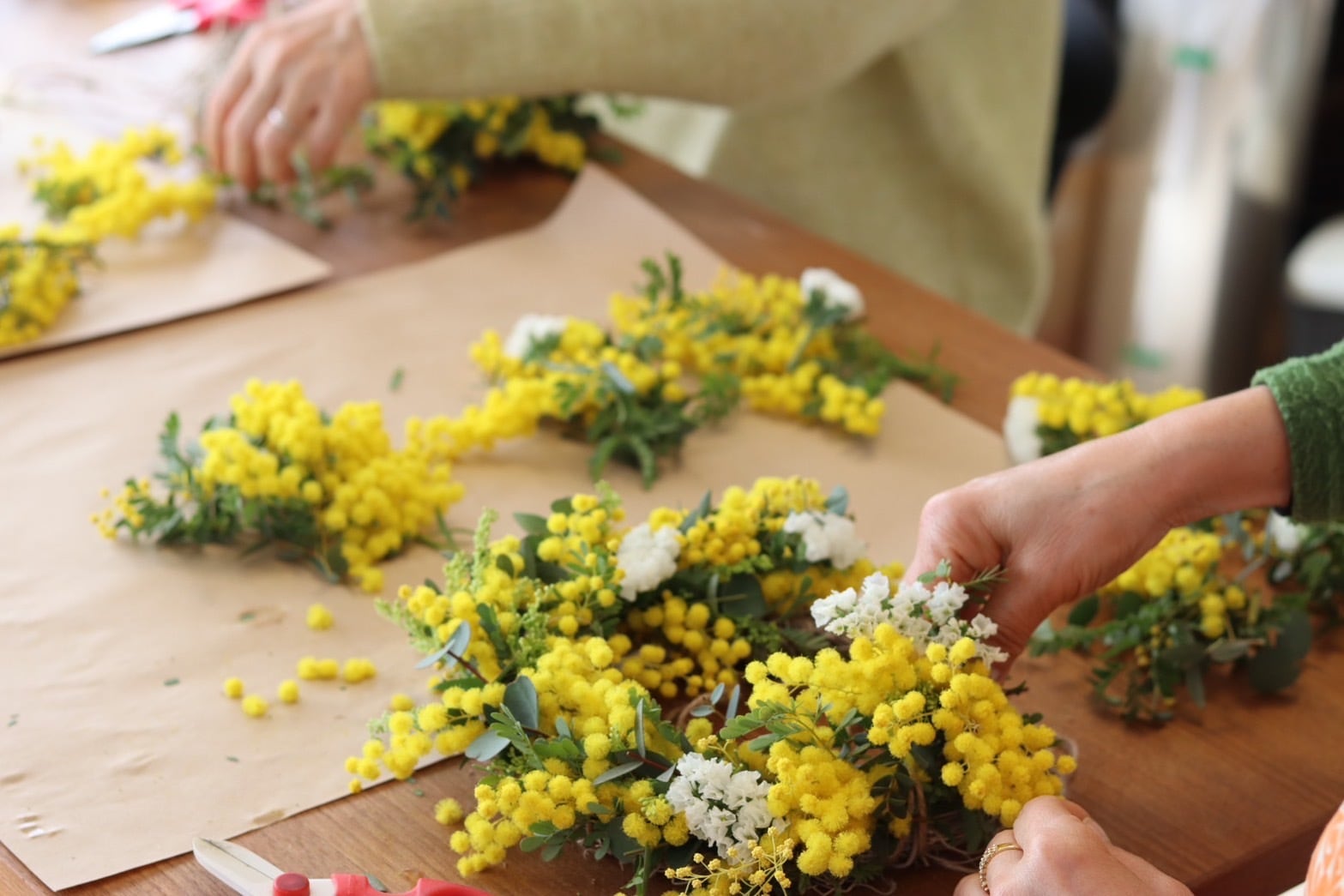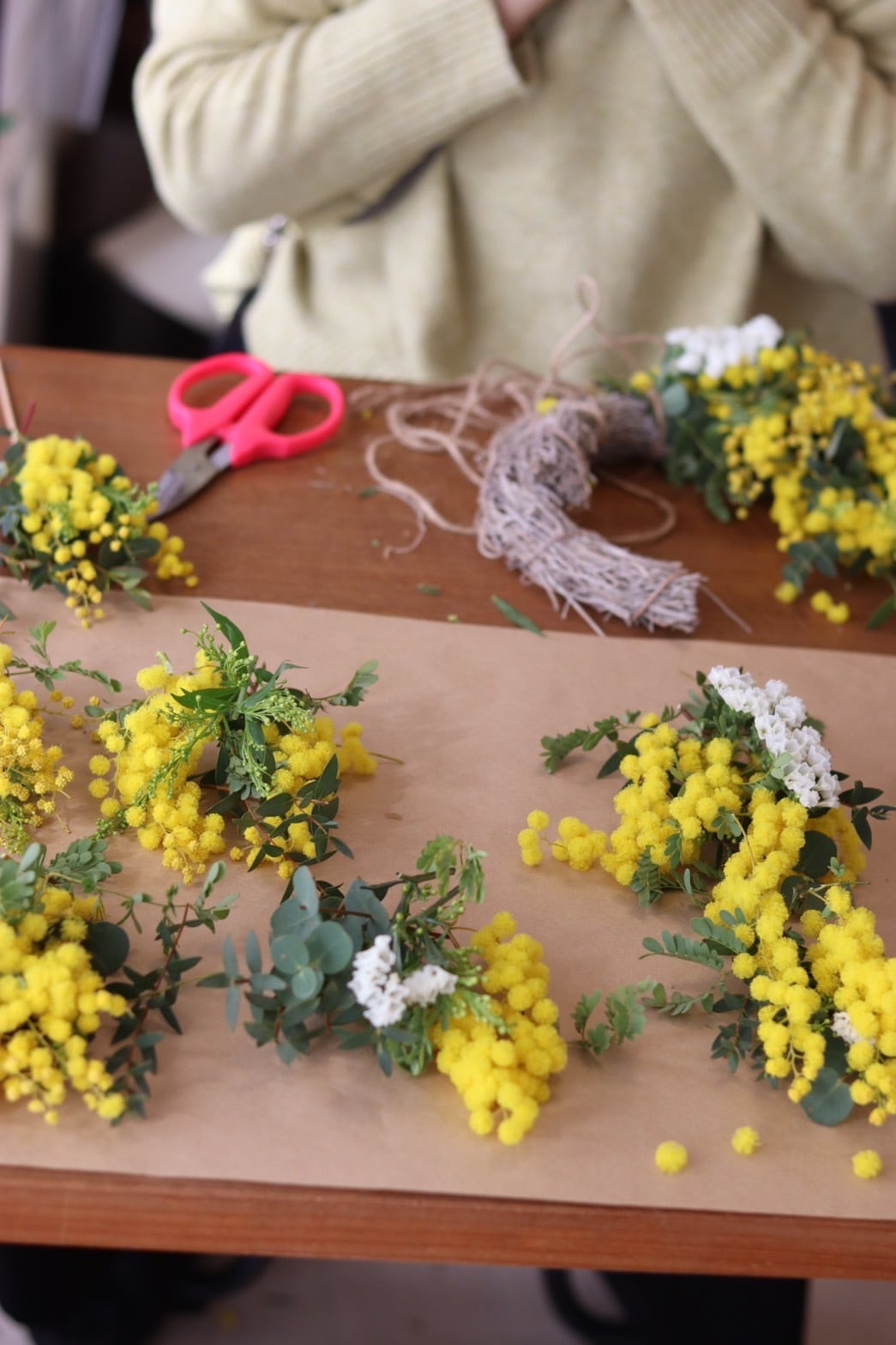 ミモザをメインにドライフラワーになるグリーンや草花も加えます