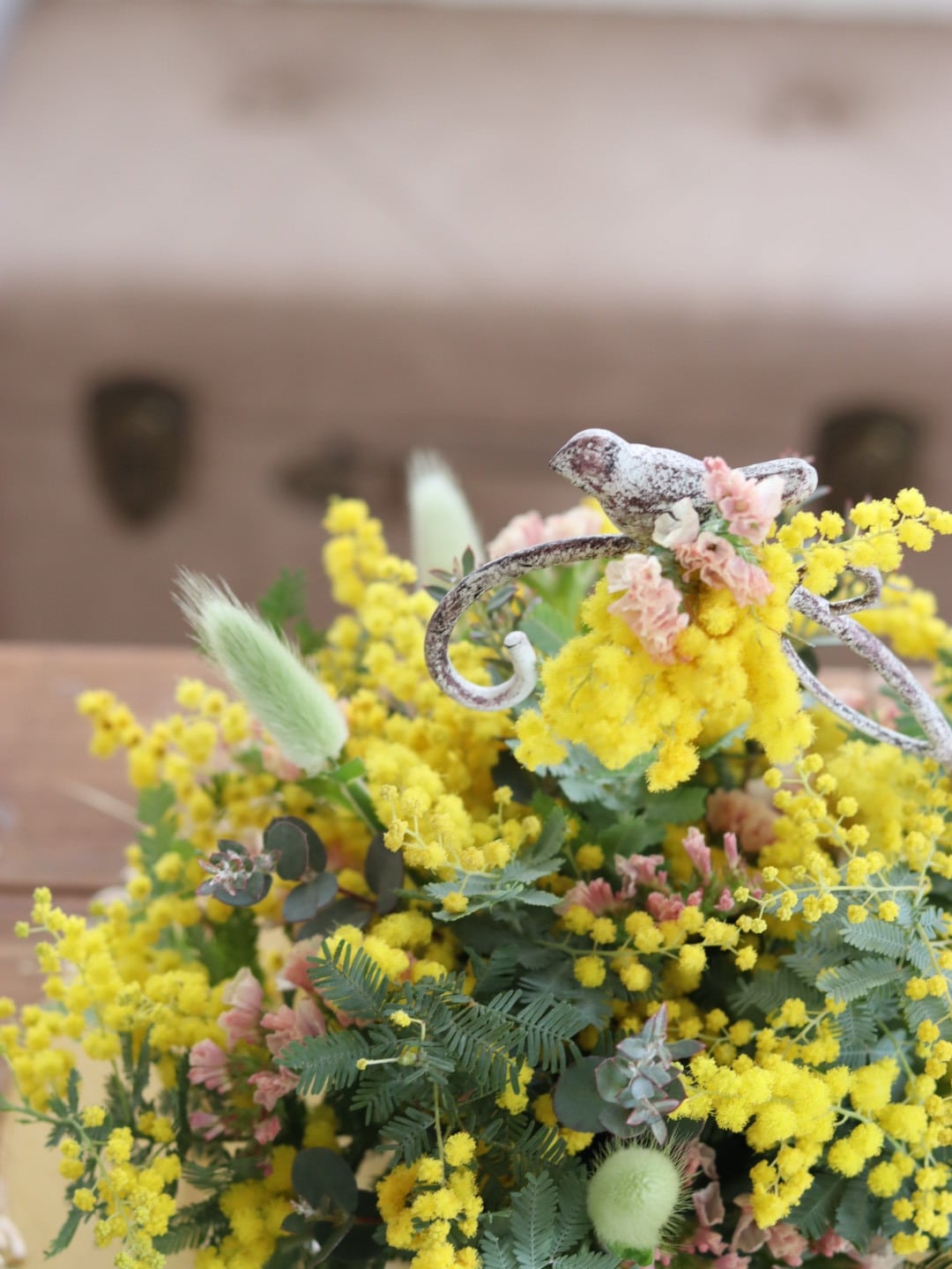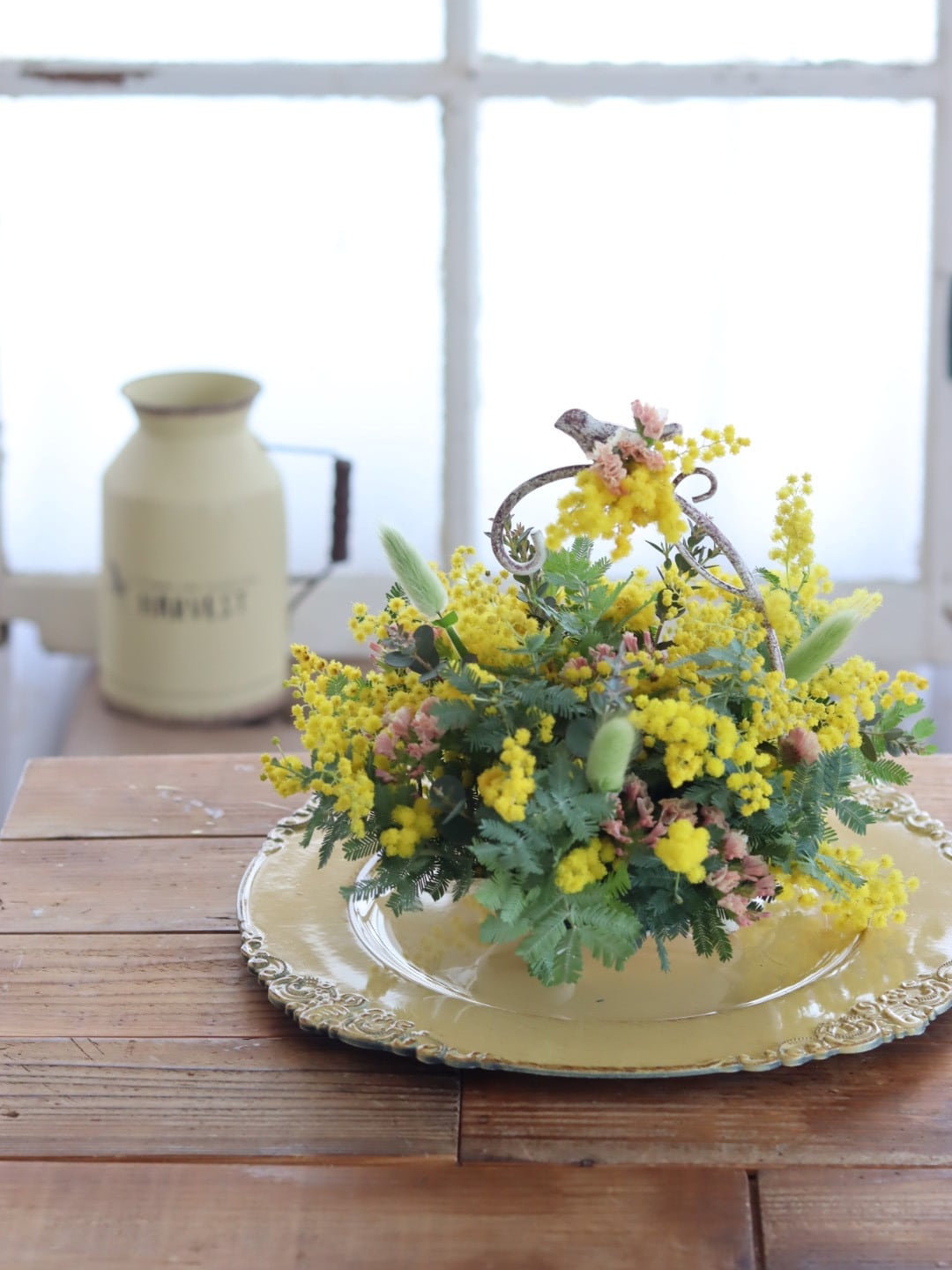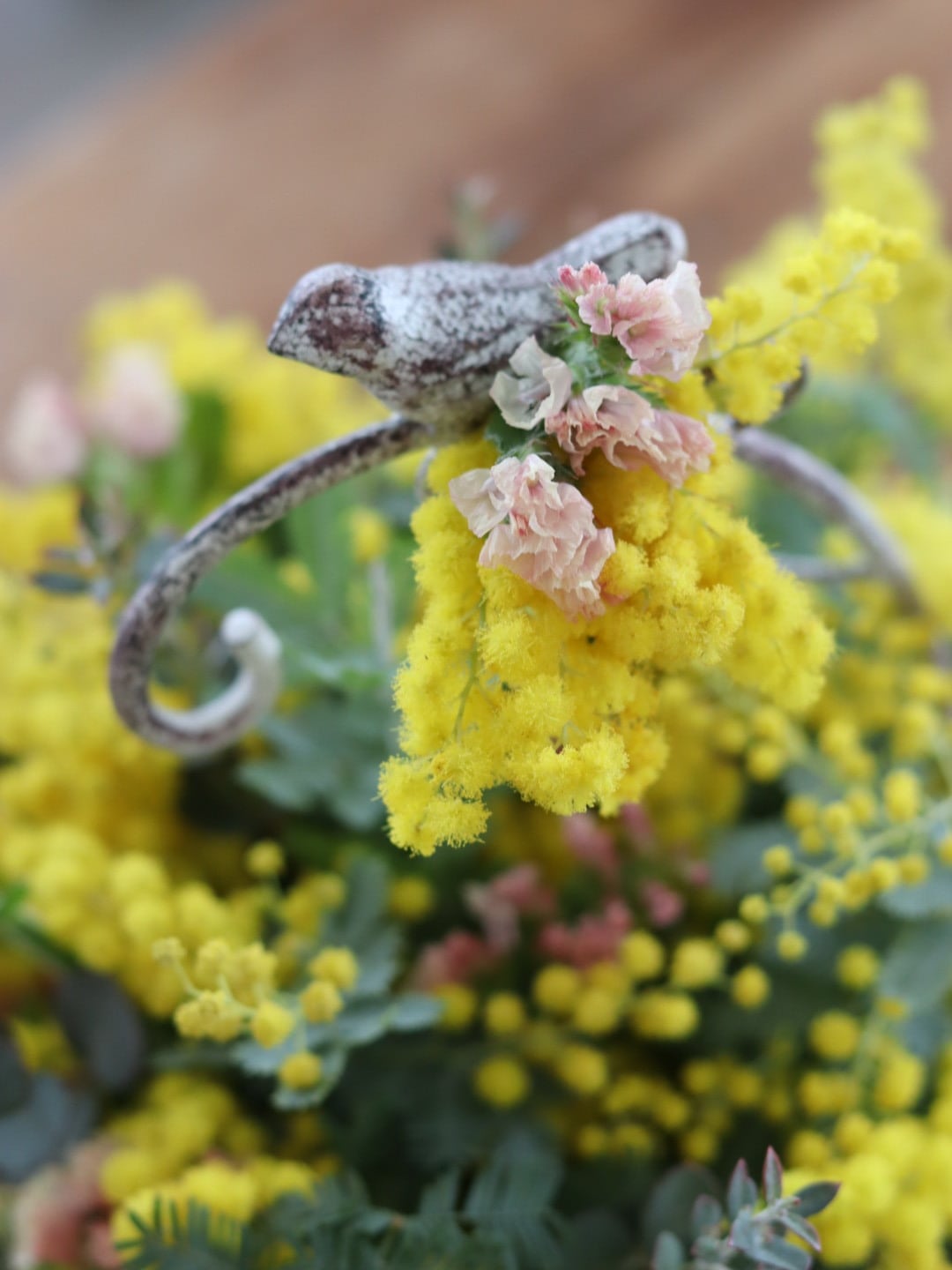 ふわふわとした小さな黄色の花を小鳥モチーフの花器と一緒にアレンジを楽しんでみませんか?