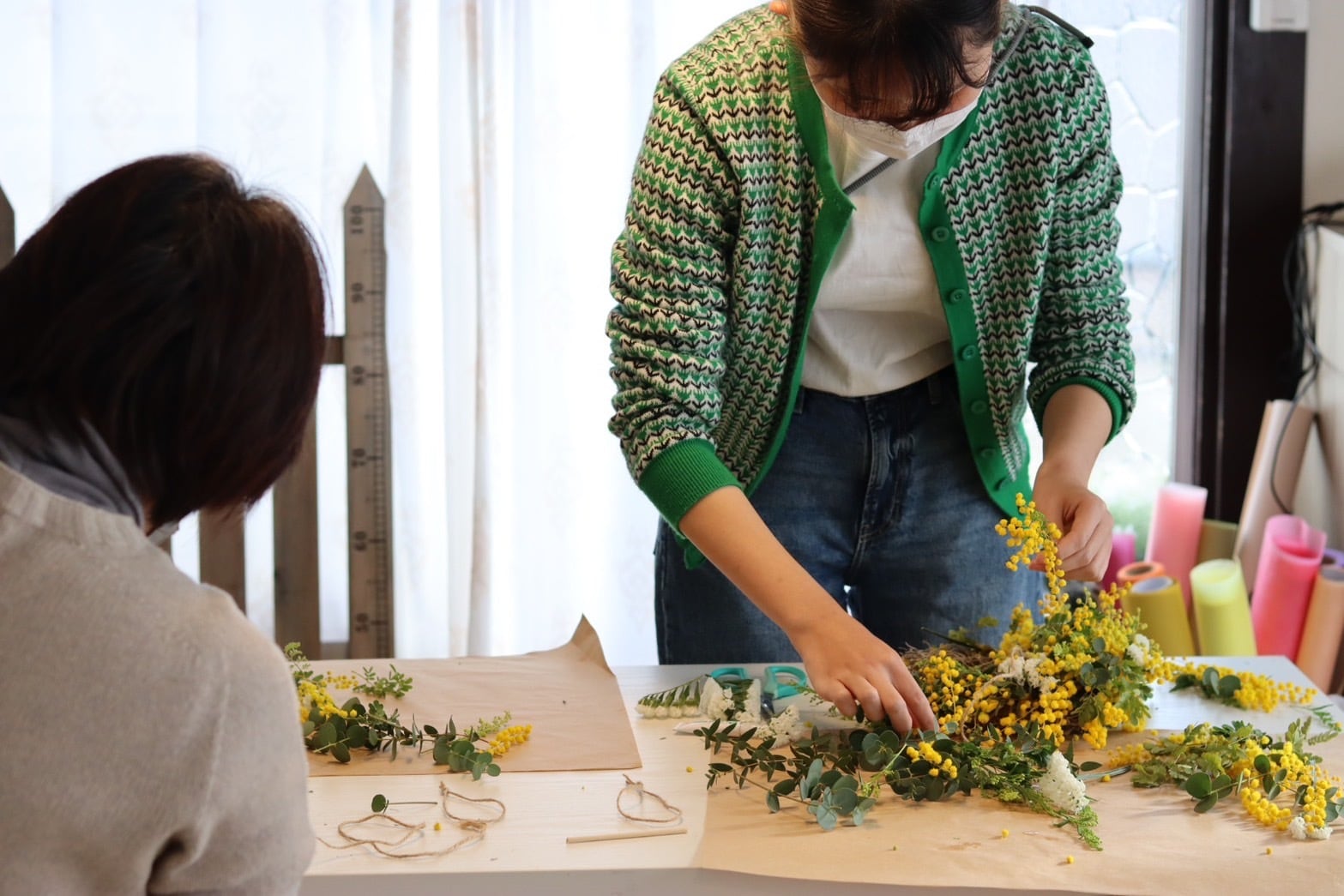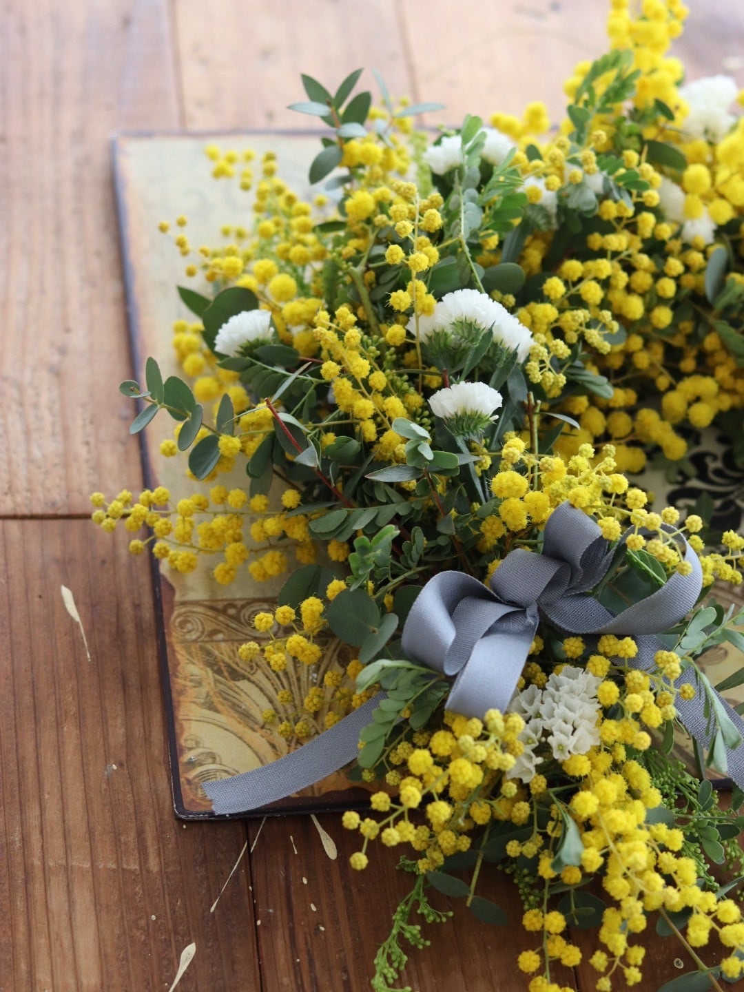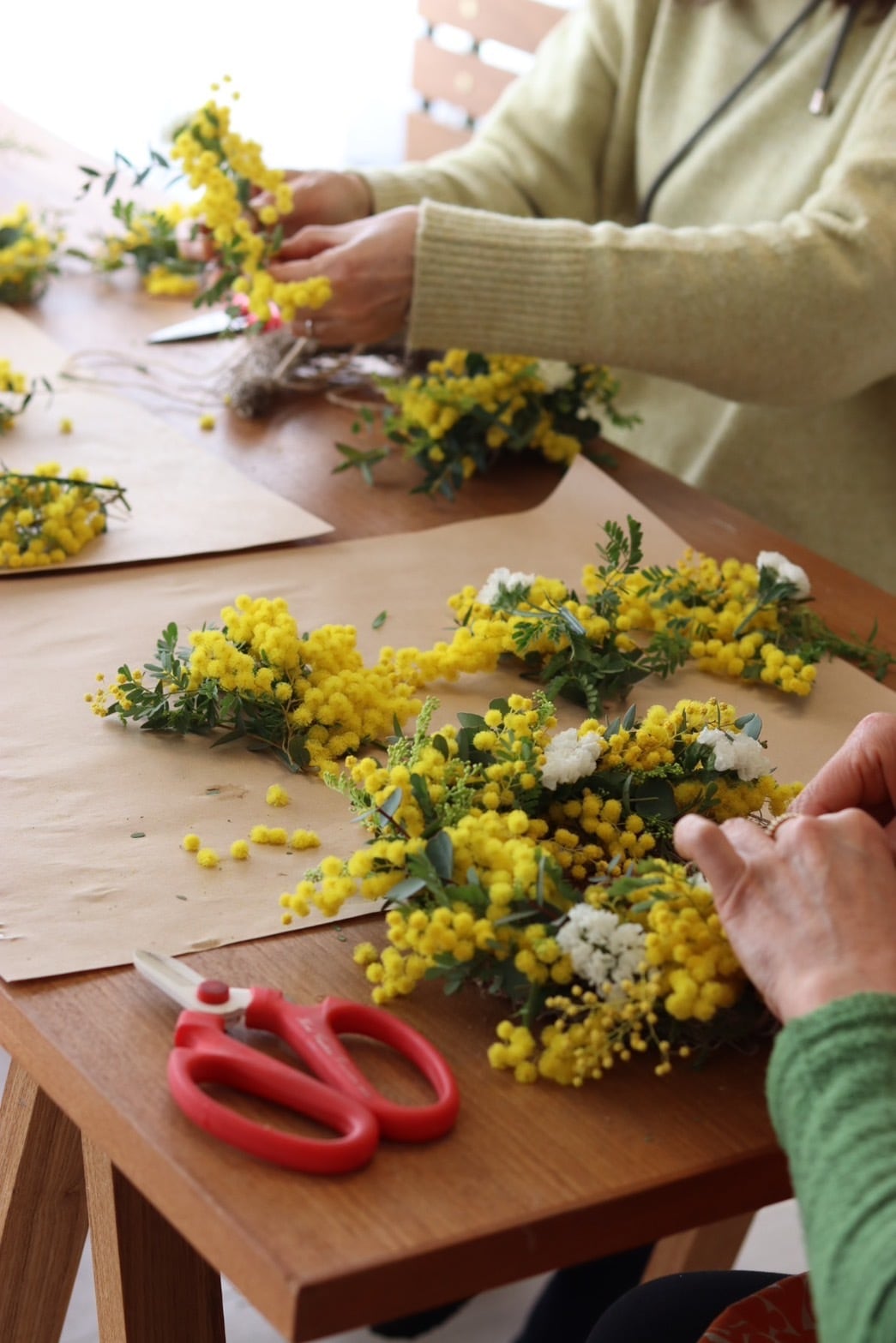 ミモザをメインにドライフラワーになるグリーンや草花も加えます