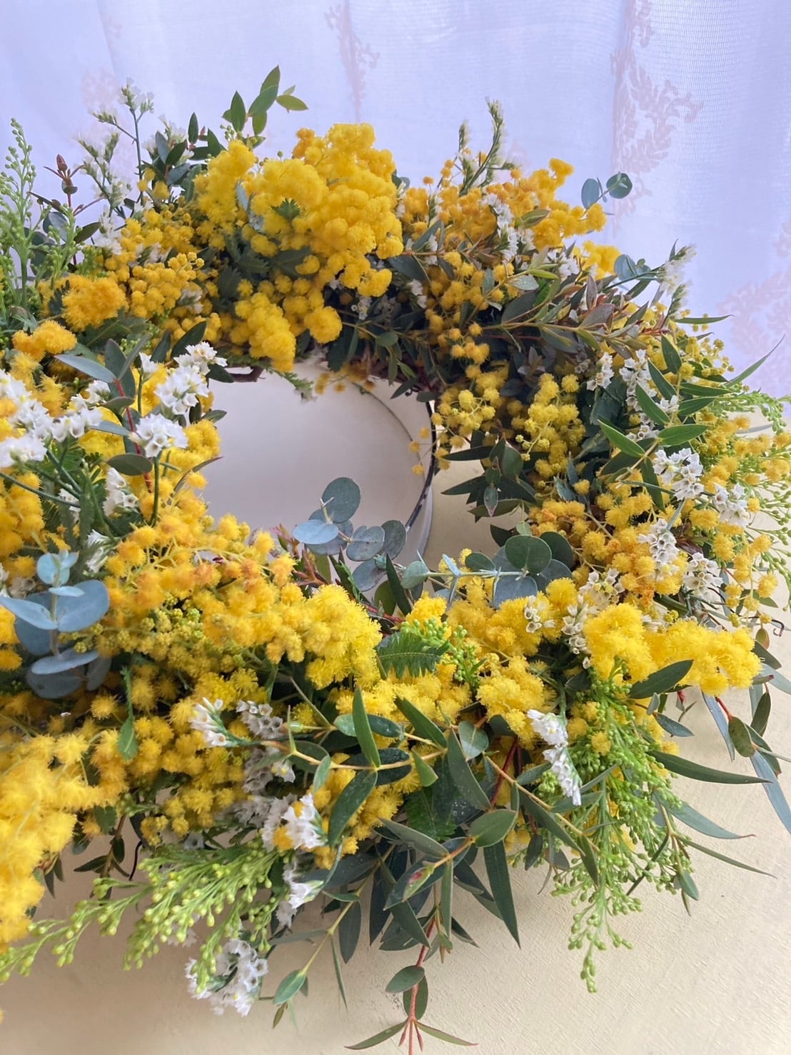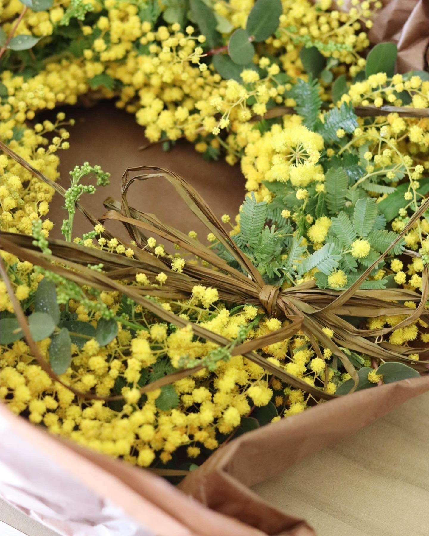 Flower noteではミモザの品質を重視するために生産者を指定して毎年ミモザの仕入れをしていますので、ふわふわとした開花した状態でリースに仕立てます