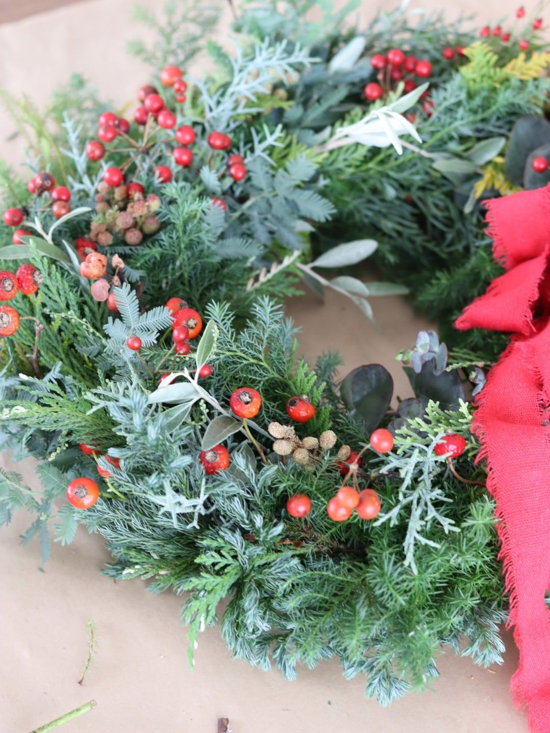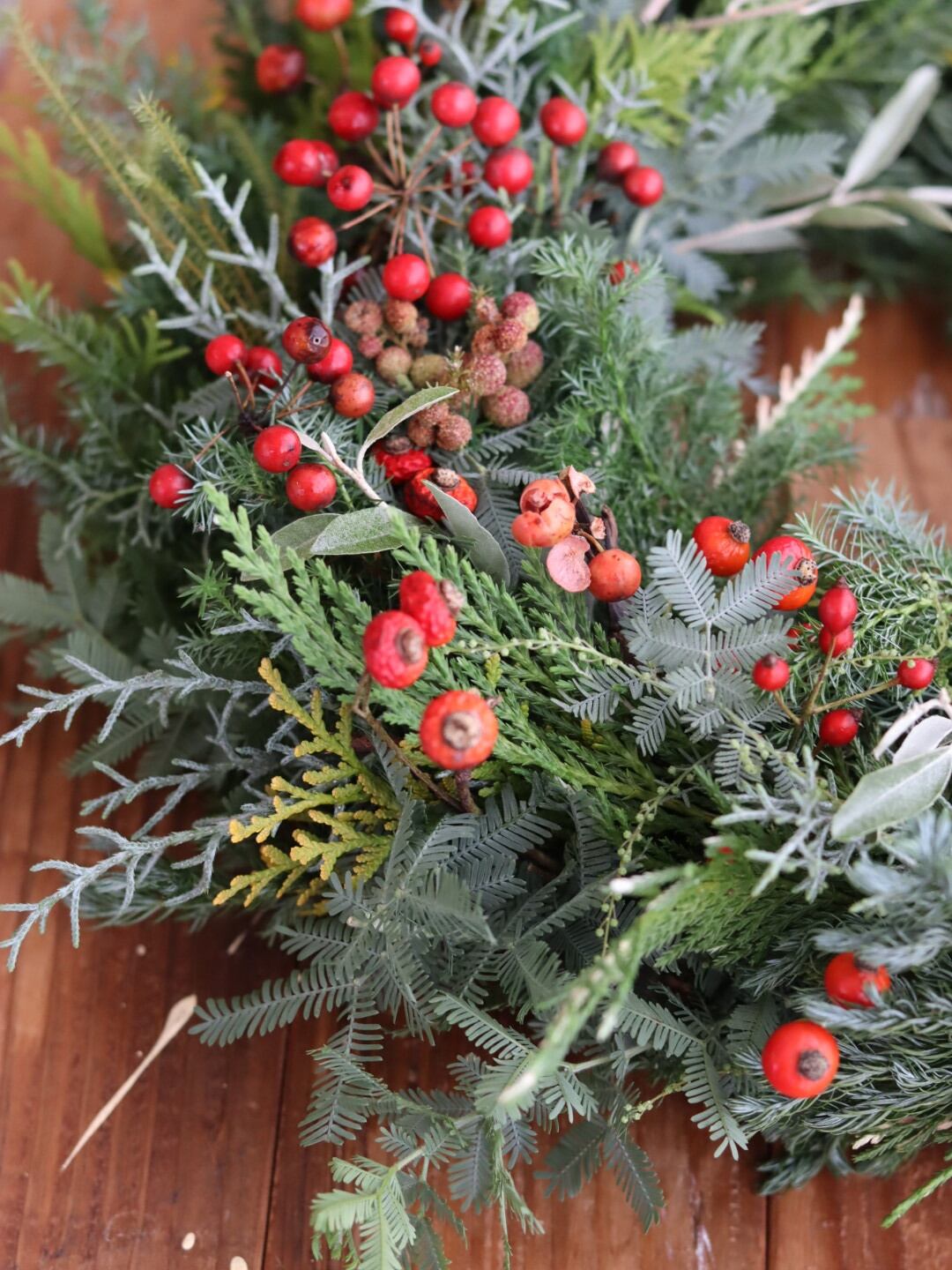 直径約35㌢、針葉樹の香りに包まれて、赤い実がアクセントになったナチュラルリースが、クリスマスを特別に彩ります。自然素材をふんだんに使用し、森のような空気感をお楽しみいただけます。壁にかけたり、テーブルに置いたりと、飾る場所を選ばず、多様にご使用いただけます。