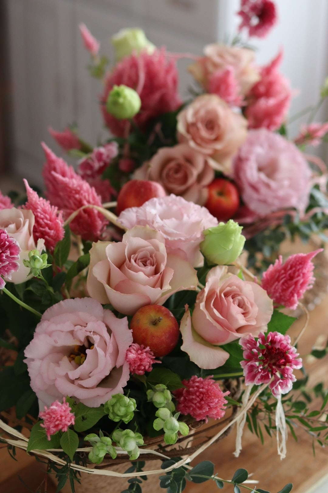 *画像の1-2枚目は【フラワーネストアレンジ】3-4枚目は【基本形スプレーシェイプ】の過去の作品例となります。テーマに合わせて花市場の出荷状況や、Flower noteのその時のインスピレーションで花合わせをします。お楽しみに。。