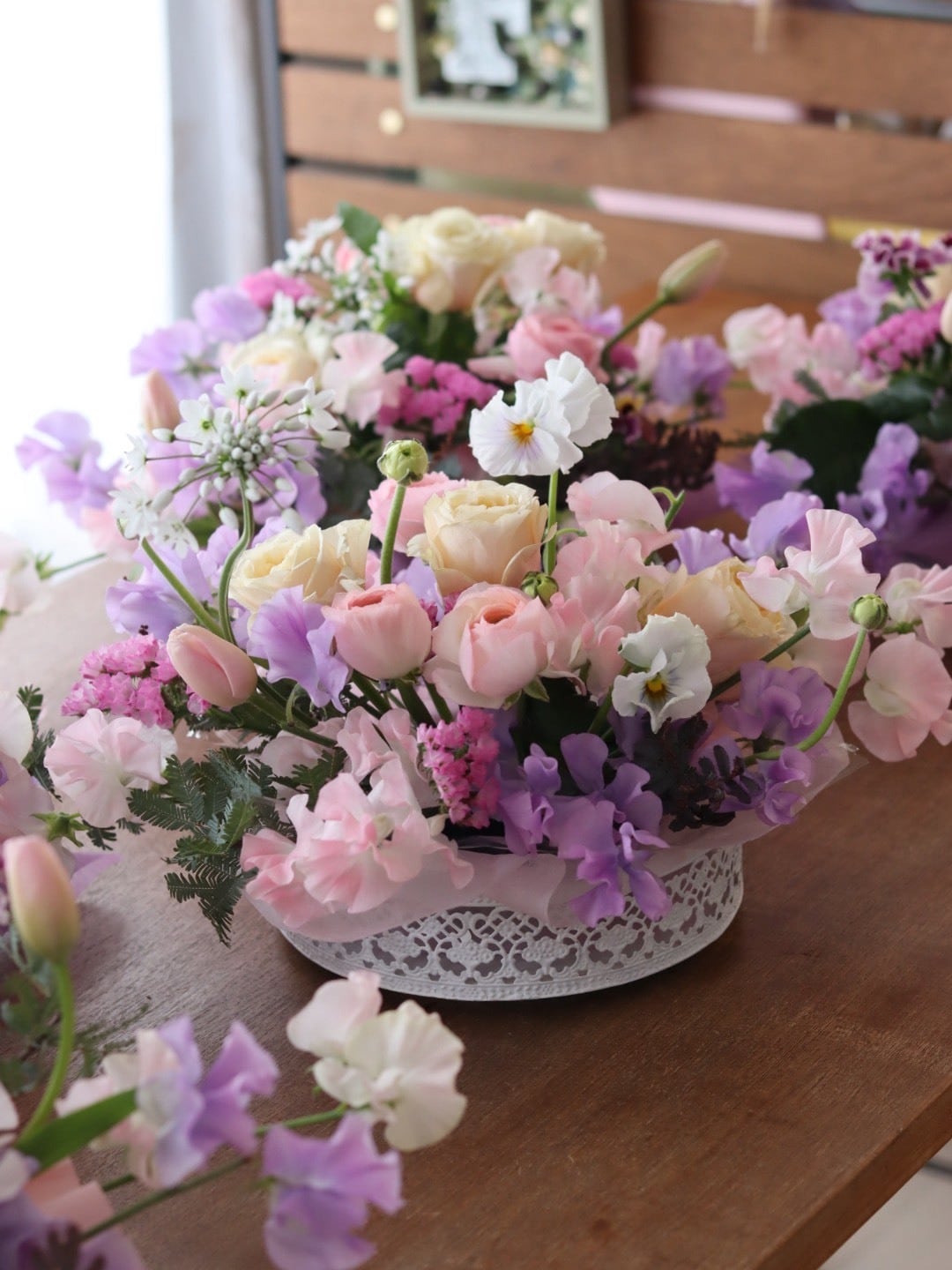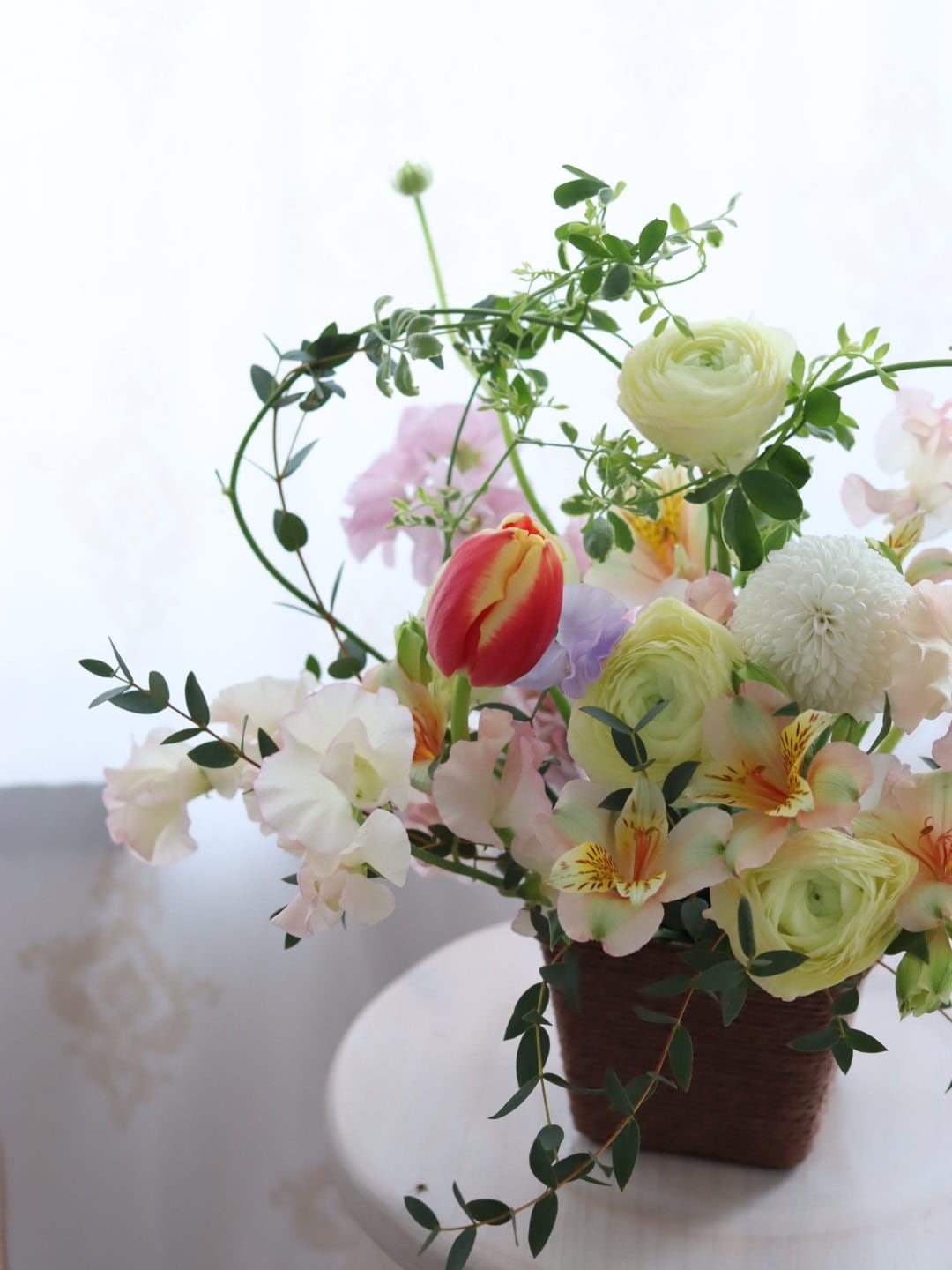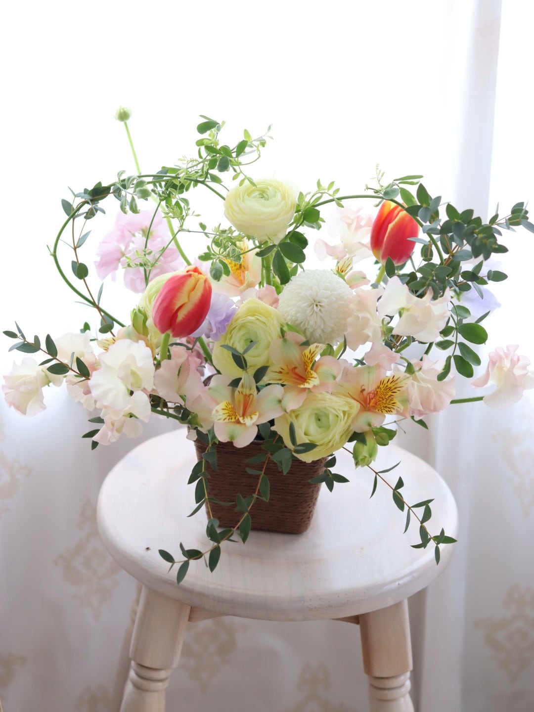「花と優しい毎日を」は季節の新鮮なお花をたっぷり使い、毎日の暮らしに草花がある心地よさを感じていただくレッスンです。