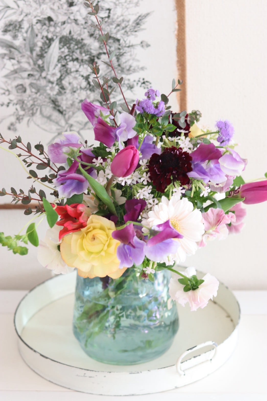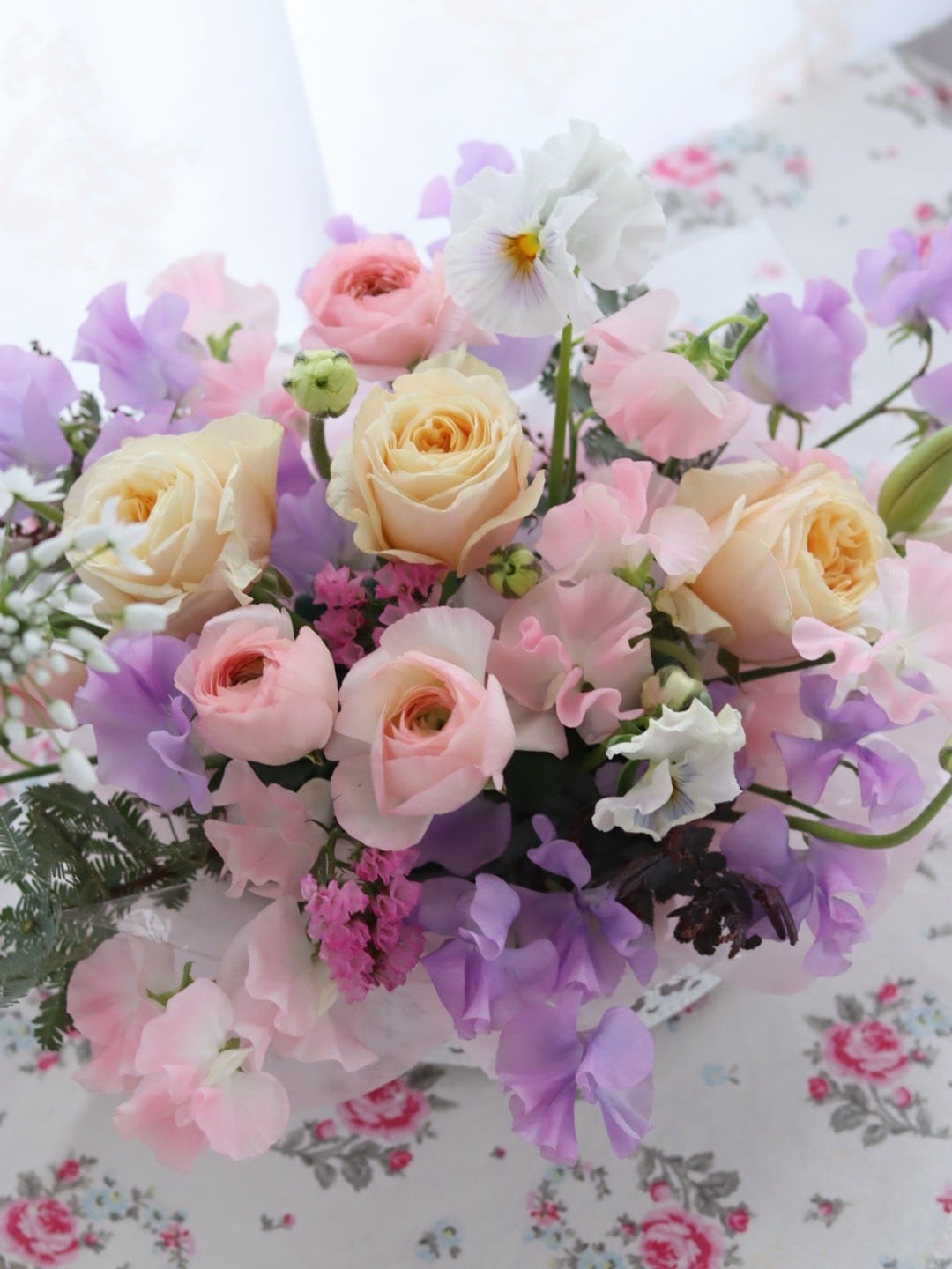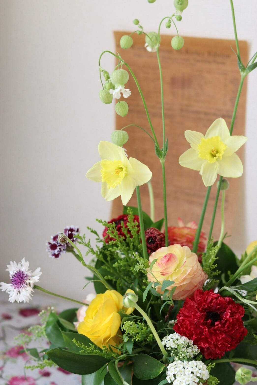 「花と優しい毎日を」は季節の新鮮なお花をたっぷり使い、毎日の暮らしに草花がある心地よさを感じていただくレッスンです。